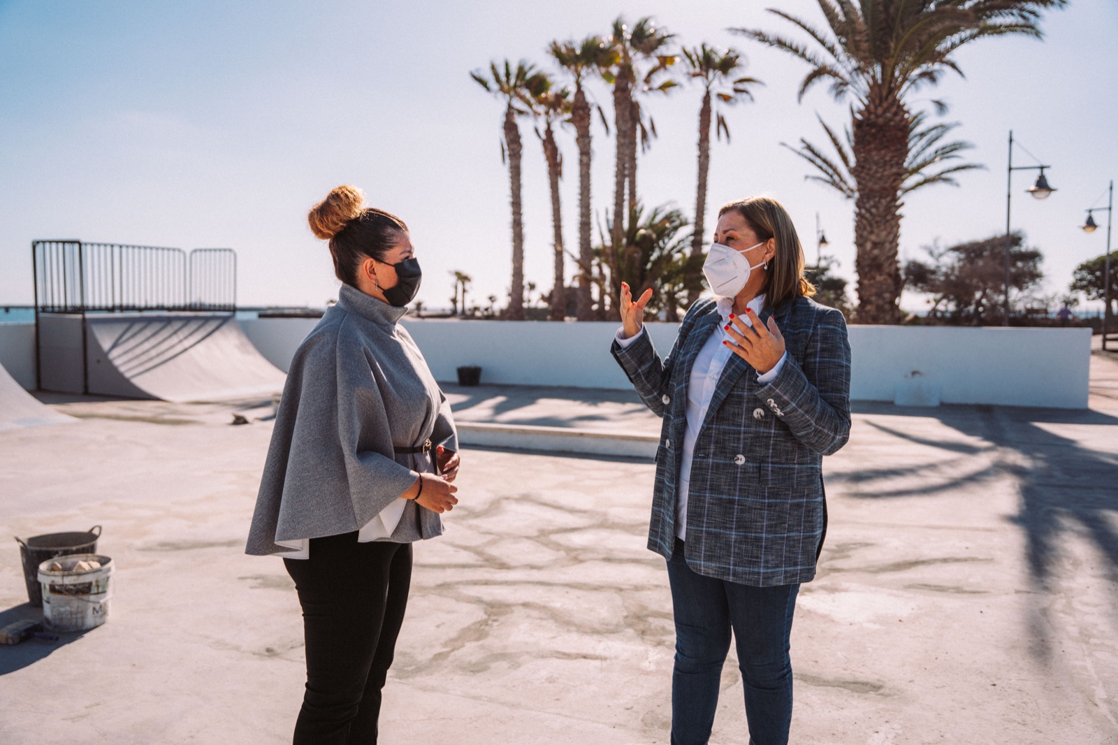 La alcaldesa de Arrecife, Astrid Pérez, y la concejal de Juventud, Eli Merino, visitaban este martes el recinto deportivo para comprobar el ritmo de las obras que se adjudicaron a finales del pasado mes de noviembre. “Con la puesta en funcionamiento del alumbrado público en la zona y la colocación de nuevo mobiliario urbano del parque temático el Skatepark se convertirá en un espacio público dinamizador para la juventud de Arrecife”, según apunta la alcaldesa Astrid Pérez.