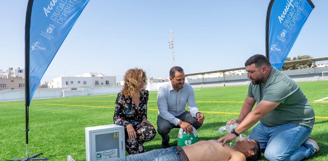 Eli Merino remarcó que «se han ubicado en lugares estratégicos, así como capacitaremos a los clubes, directivos y monitores en técnicas de reanimación cardiopulmonar (RCP) para que, si tuvieran que intervenir, sepan utilizar estos equipos que estamos instalando en todas las instalaciones deportivas del Ayuntamiento de Arrecife».