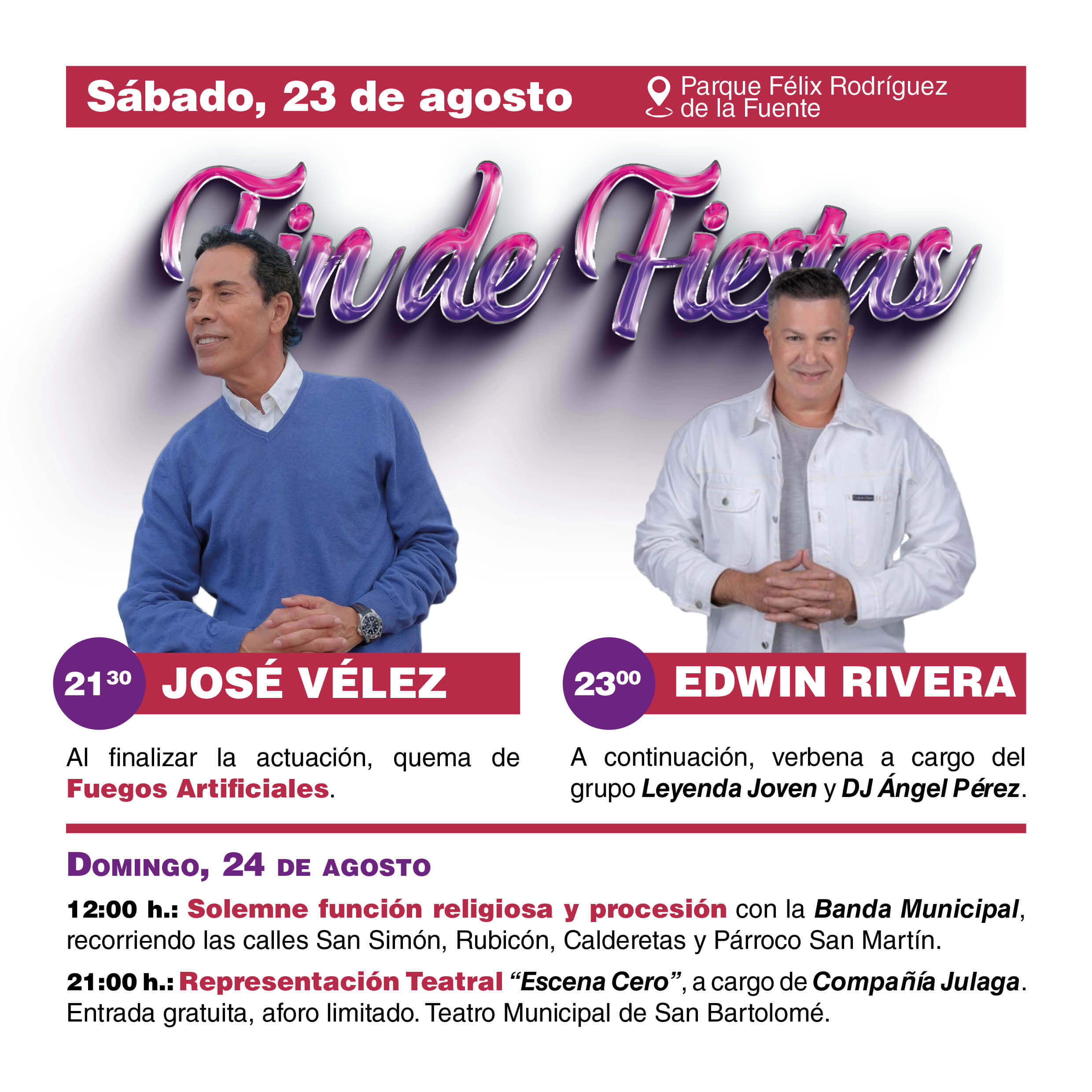 La concejala de Festejos, Estefanía Luzardo, recuerda que la actuación de José Vélez comenzará a las 21:30 horas, y estará seguida de los fuegos artificiales en el parque Félix Rodríguez de la Fuente, y, posteriormente, actuará desde las 23:00 horas en la misma localización Edwin Rivera, concluyendo la noche con la verbena popular, con Leyenda Joven y DJ Ángel Pérez. Además, la función religiosa del 24 de agosto comenzará a las 12:00 horas, recorriendo las calles San Simón, Rubicón, Calderetas y Párroco San Martín.