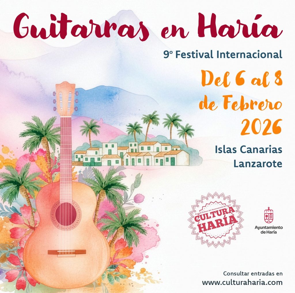 El Ayuntamiento de Haría, a través del Área de Cultura, y en colaboración con el Cabildo de Lanzarote, lleva a cabo la novena edición del Festival Internacional de Guitarra. Este encuentro se celebrará del 6 al 8 de febrero en distintos espacios del municipio, como la Sala El Aljibe o el Auditorio de la Cueva de los Verdes.