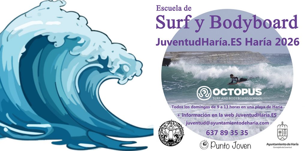 El Ayuntamiento de Haría, a través de la Concejalía de Juventud, ha puesto en marcha una nueva edición de la ‘Escuela de Surf y Bodyboard Juventud Haría 2026’. La iniciativa gratuita se desarrollará todos los domingos del año, a partir del 8 de febrero, en horario de mañana principalmente, en la playa La Garita, en Arrieta.