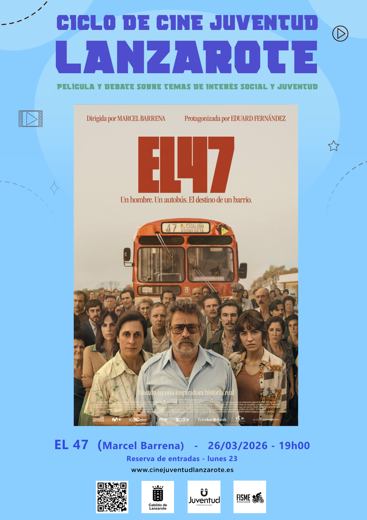 El Cabildo de Lanzarote, a través del Área de Juventud, que lidera la consejera Aroa Revelo, continúa la programación del Ciclo de Cine Juventud Lanzarote 2026 con la proyección de la película ‘El 47’, estrenada en 2024 y dirigida por Marcel Barrena. La cita será el próximo jueves, 26 de marzo, a las 19:00 horas, en la sala 4 de los Multicines Atlántida.