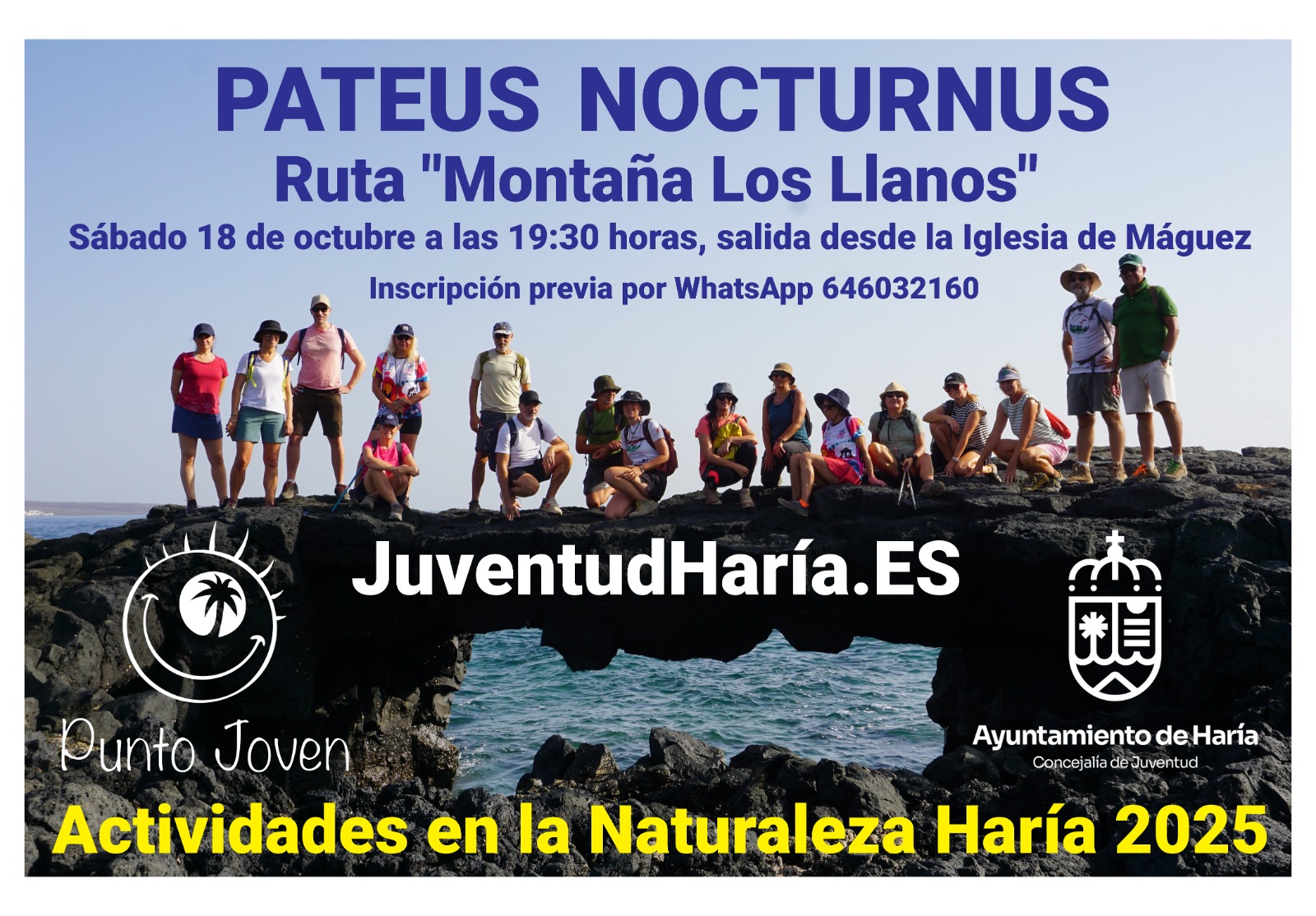 El Ayuntamiento de Haría, a través del Punto Joven del departamento de Juventud, invita a toda la población a participar en el próximo Pateus Nocturnus, que se celebrará el sábado 18 de octubre, con una ruta nocturna por Montaña Los Llanos. La salida tendrá lugar a las 19:30 horas desde la Iglesia de Máguez.