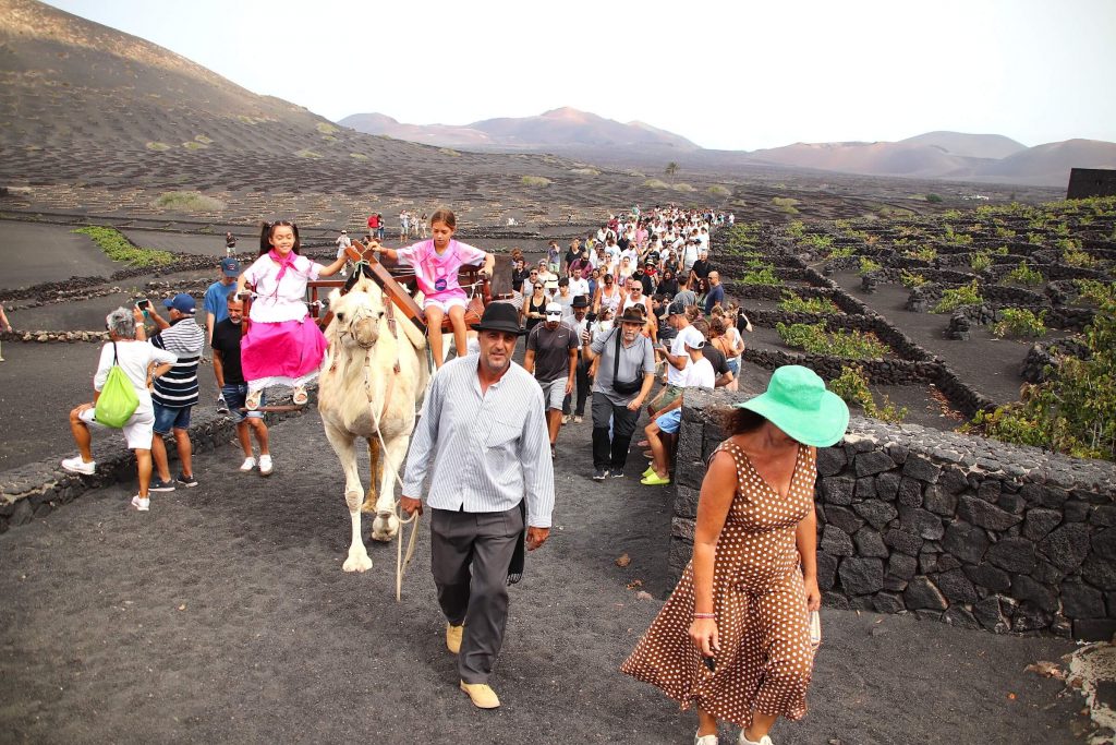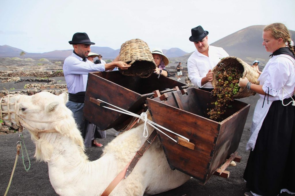 La interpretación de la recogida de la uva con camellos a la usanza de viejas generaciones de agricultores, cuando ni por asomo se preveía la tecnificación del sector vitivinícola de Lanzarote, siempre atrae a cientos y cientos de visitantes al singular paisaje de La Geria, pero este año fue especialmente visible y notorio el trasiego constante de vecinos, vecinas y turistas de la Isla que se acercaron hasta Bodega La Geria y las fincas de su entorno para seguir de cerca y participar este 15 de agosto de la vendimia tradicional, día señalado por la festividad de Nuestra Señora de La Caridad en La Geria y la conmemoración católica de la Asunción de la Virgen.