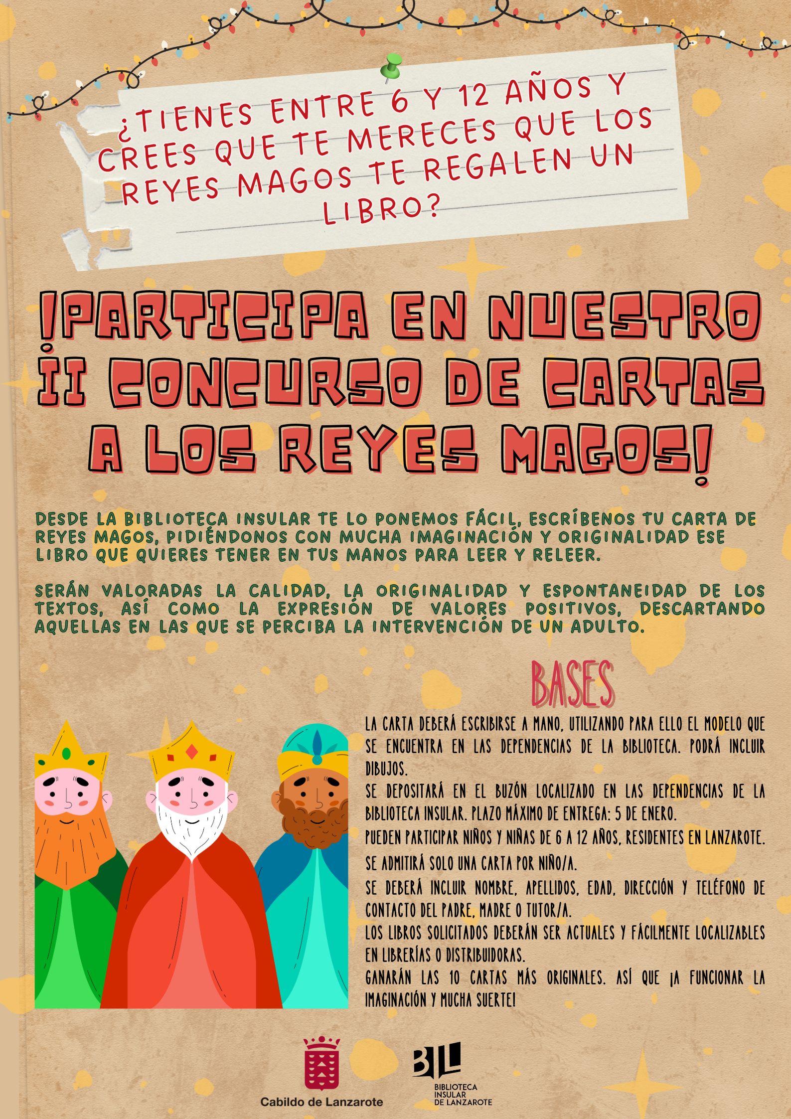 Por otro lado, en la segunda edición del concurso epístola ‘Escribe tu carta a los Reyes Magos’, los niños y niñas de entre 6 y 12 años residentes en Lanzarote están invitados a redactar una carta muy especial a sus Majestades de Oriente. Además, la peculiaridad de esta actividad es que los participantes deben pedir un libro que deseen leer una y otra vez, fomentando la creatividad, la lectura y los valores positivos.