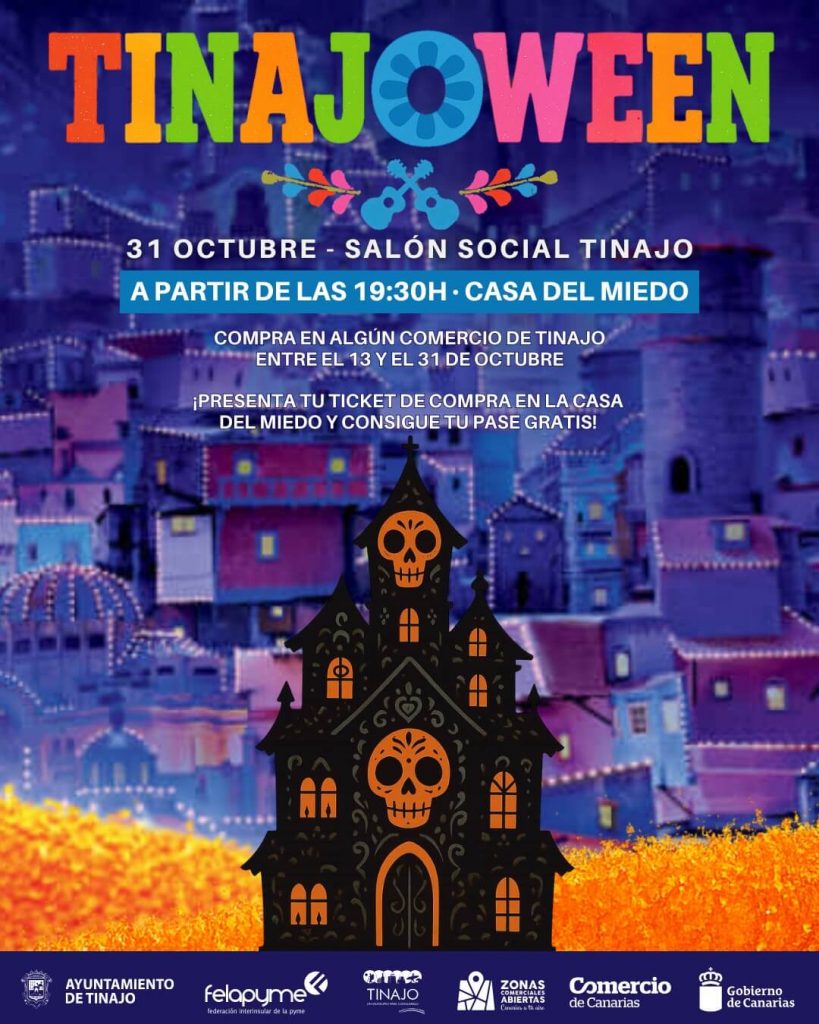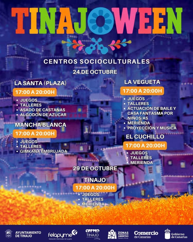Desde el día 24 de octubre arrancan en Tinajo las actividades en torno a la celebración de la cuarta edición de “Tinajoween”, una iniciativa que llenará de colorido y terror el municipio y que culminará el 31 de octubre en la Plaza San Roque, todo ello con el objetivo de dinamizar la actividad comercial, fomentando el consumo y el apoyo al pequeño comercio, acercando a comerciantes y consumidores alrededor de una fecha señalada como es Halloween.