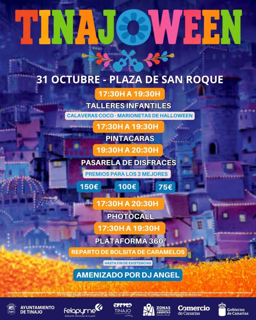 En la jornada del 31 de octubre la Plaza de San Roque se convertirá en el epicentro de la celebración de “Tinajoween”. A partir de las 17:30 horas los más chinijos de la casa disfrutarán con talleres infantiles de calaveras de Coco, el personaje de Pixar y Disney, además de marionetas de Halloween, además de pintacaras. A las 19:30 horas tendrá lugar la pasarela de disfraces, con premios de 150, 100 y 75 euros para los tres mejores.