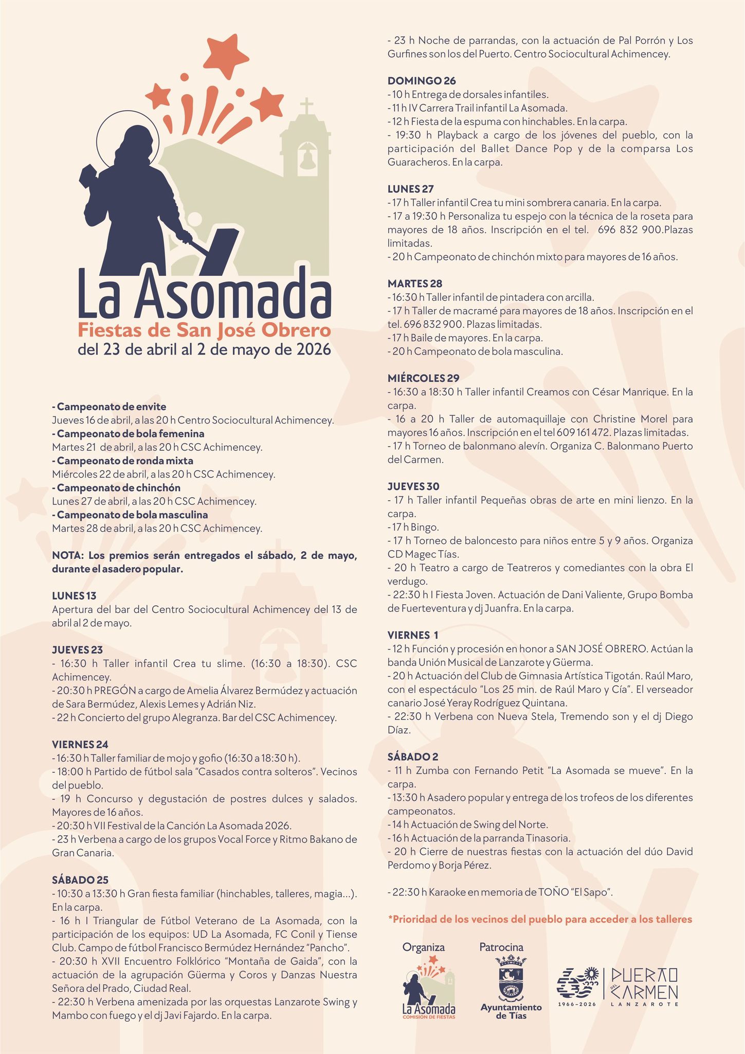 El alcalde de Tías, José Juan Cruz, y la concejala de Fiestas, Miriam Hernández, invitan a la ciudadanía a participar en estas fiestas, que tendrán un arranque previo con los campeonatos de envite, chinchón, ronda y bola canaria, además de la apertura del bar del Centro Sociocultural (CSC) Achimencey desde el 13 de abril.