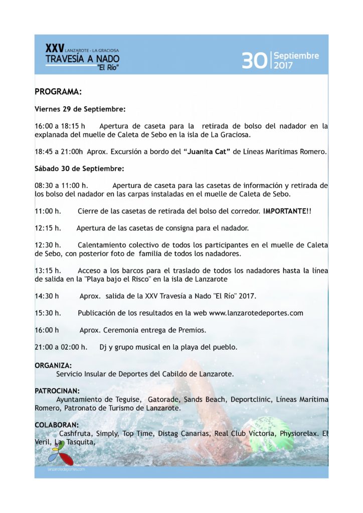 Organizada por el Cabildo de Lanzarote, a través del Servicio Insular de Deportes, con la colaboración del Ayuntamiento de Teguise, la XXV Travesía a Nado El Río cuenta con el patrocinio de Ahembo-Gatorade, Sands Beach, Deportclinic, Líneas Marítimas Romero y Patronato de Turismo de Lanzarote. También colaboran Real Club Victoria, Casfruta, Simply, Top Time, Distag Canarias, Physiorelax, El Veril y La Tasquita.