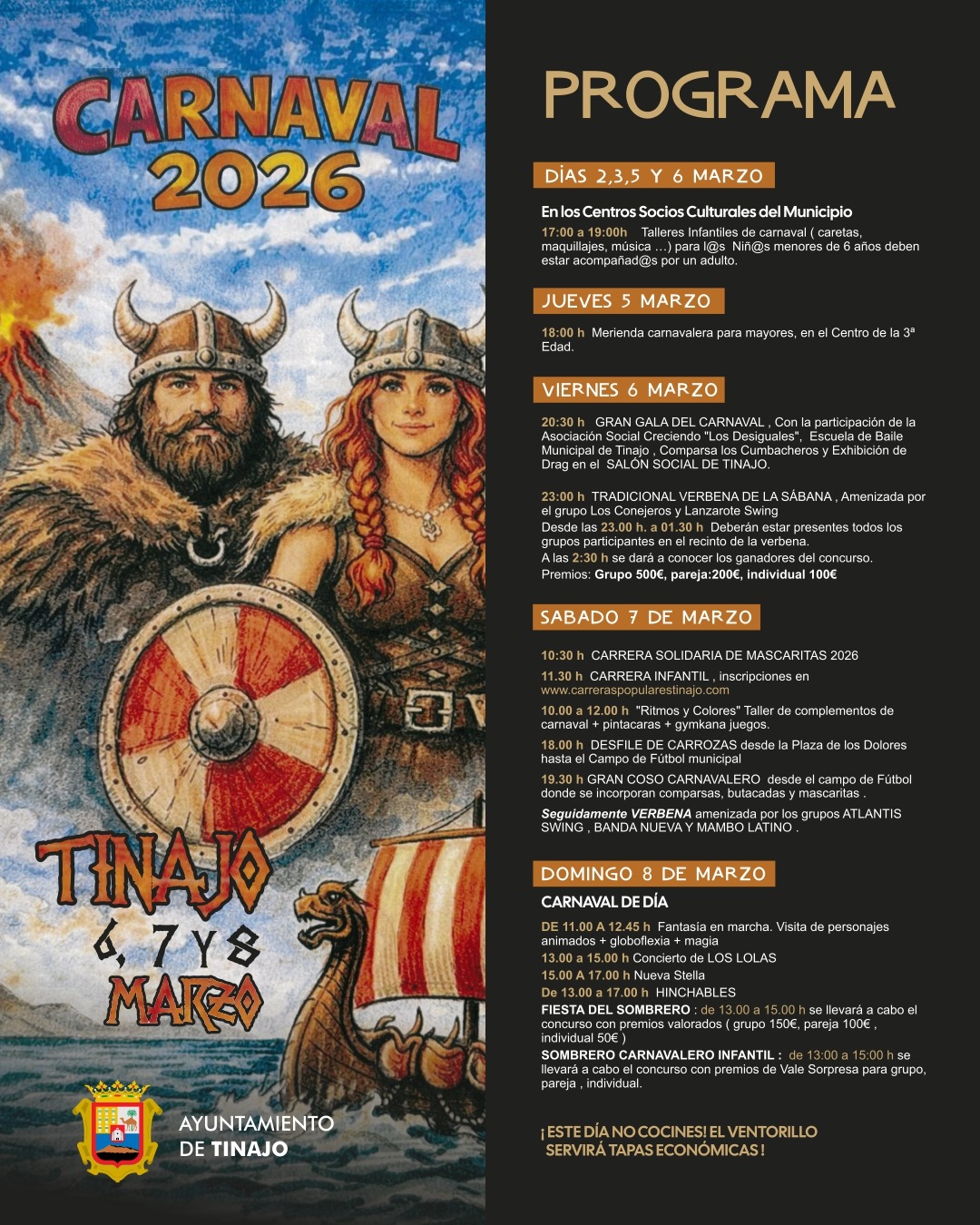 Tinajo ya tiene todo dispuesto para disfrutar, un año más, del Carnaval. El Carnaval de Tinajo 2026, bajo la alegoría de “Los Vikingos”, se celebrará del 6 al 8 de marzo.