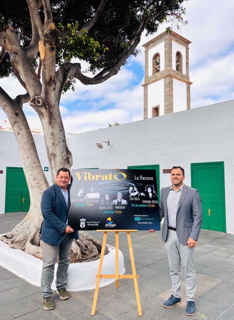 El alcalde de Arrecife, Yonathan de León, y el concejal de Actos y Eventos, Óscar López, han presentado en la mañana de este martes Vibrato, la nueva propuesta dinamizadora del Gobierno Municipal con noches de humor y música organizadas de manera directa por el Ayuntamiento de Arrecife en el interior La Recova.