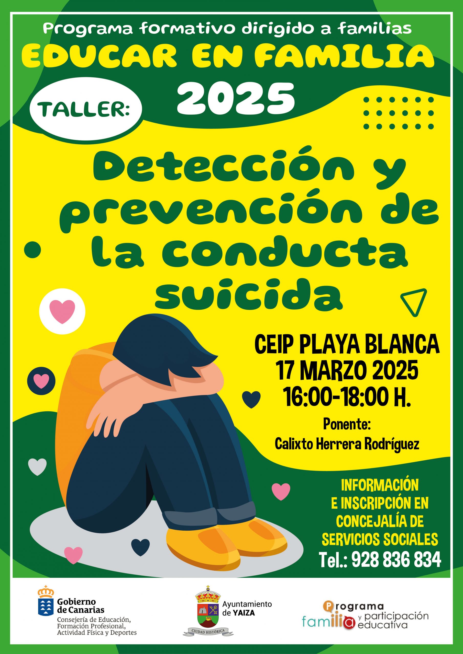 El Ayuntamiento de Yaiza invita al taller ‘Detección y prevención de la conducta suicida’ que será impartido por el reconocido psicopedagogo Calixto Herrera Rodríguez el próximo lunes 17 de marzo, de 16:00 a 18:00 horas, en el CEIP Playa Blanca. La entrada es libre y para participar solo hay que inscribirse en el Área de Servicios Sociales llamando al número 928836834.