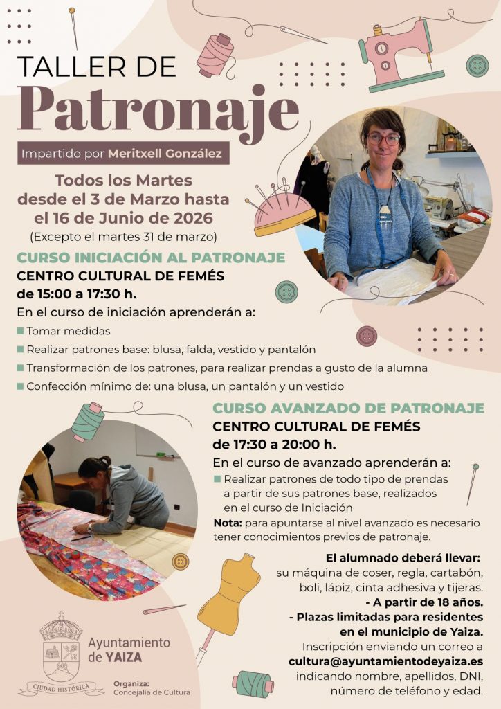 Por otra parte, el 3 de marzo, comienza otro taller de patronaje en los niveles de iniciación y avanzado, impartidos ambos por Meritxell González, en el Centro Cultural de Femés. Para participar de este y todos los talleres es necesario inscripción previa enviando un email a cultura@ayuntamientodeyaiza.es, indicando nombre, apellidos, DNI, número de contacto y edad. Toma de medidas, realización de patrones base para blusa, falda, vestido o pantalón, transformación de patrones y confección, forman parte del contenido de este taller. La información detallada la entrega el Área de Cultura de Yaiza.
