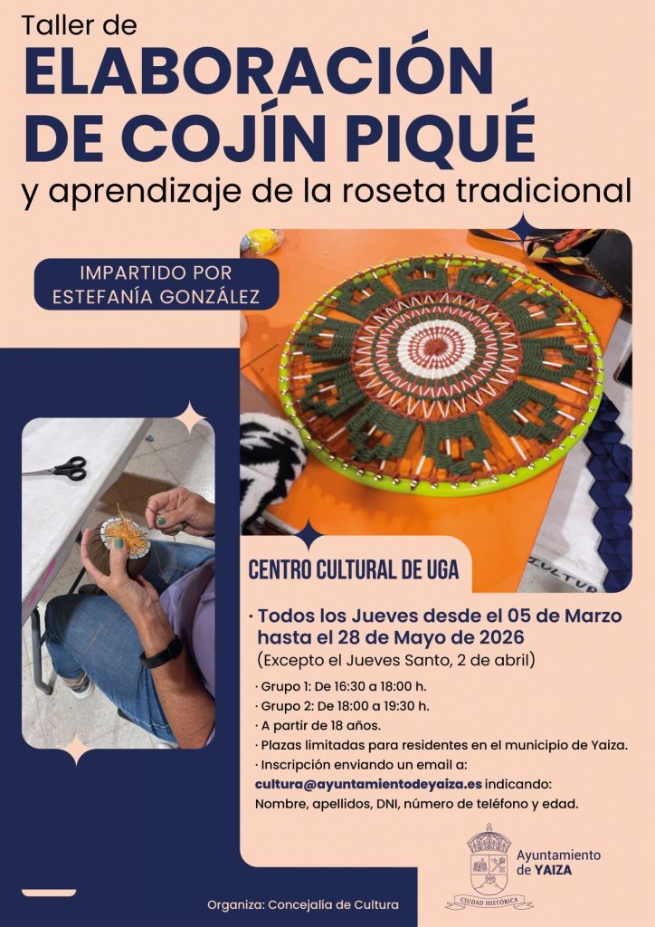 El 5 de marzo es la fecha señalada para el inicio de dos talleres más. El de empleita, impartido por la artesana Yolanda Torres, en el Centro Cultural de La Breñas, y el taller de cojín piqué y roseta tradicional impartido por Estefanía González en el Centro Cultural de Uga. Este último está previsto todos los jueves, del 5 de marzo al 28 de mayo, con plazas limitadas para residentes de Yaiza.