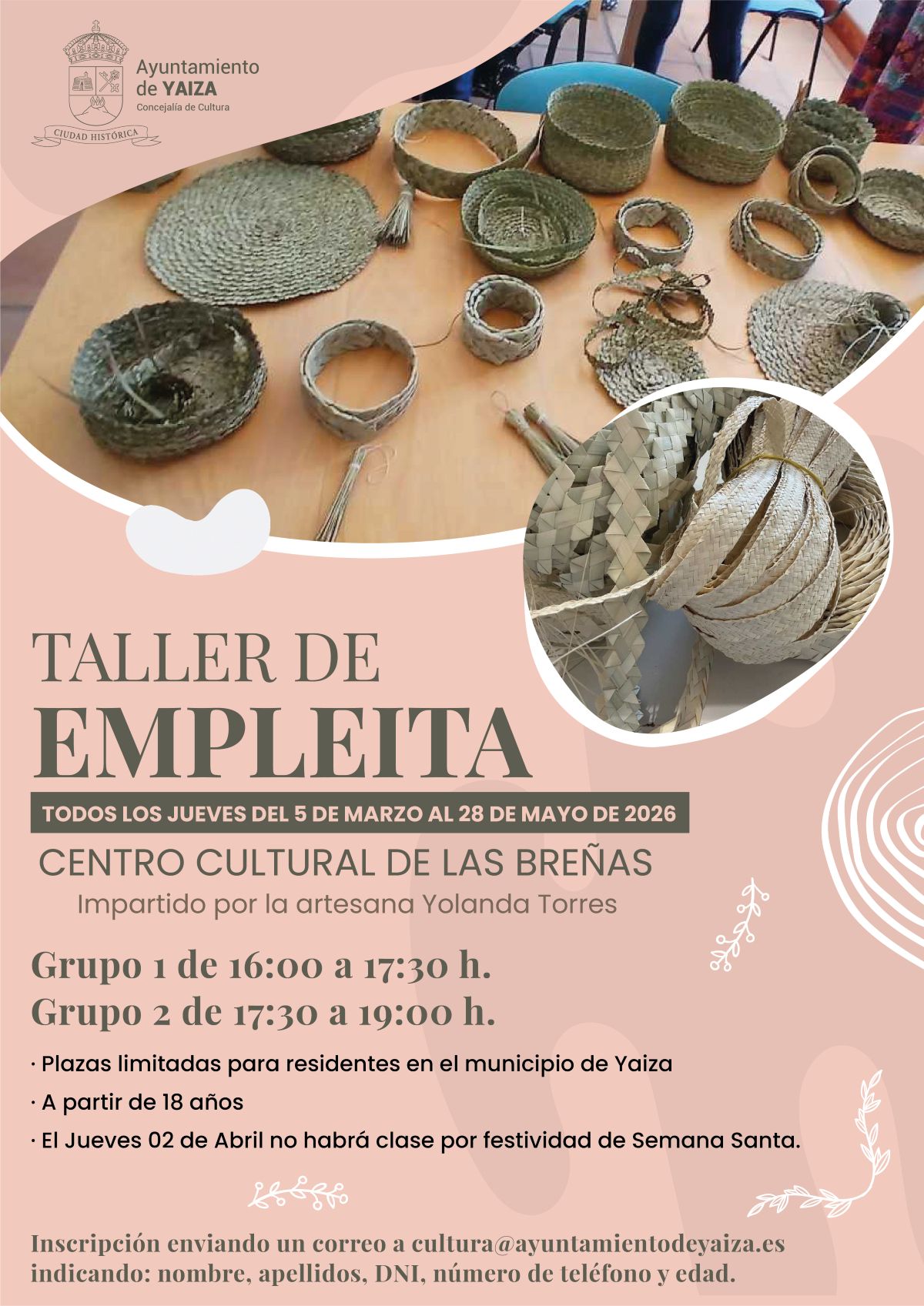 El 5 de marzo es la fecha señalada para el inicio de dos talleres más. El de empleita, impartido por la artesana Yolanda Torres, en el Centro Cultural de La Breñas, y el taller de cojín piqué y roseta tradicional impartido por Estefanía González en el Centro Cultural de Uga. Este último está previsto todos los jueves, del 5 de marzo al 28 de mayo, con plazas limitadas para residentes de Yaiza.